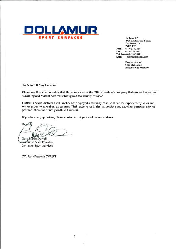 “ Hakobee-Sports is our only Agent in Japan that can deal with wrestling mats provided by Dollamur. ”